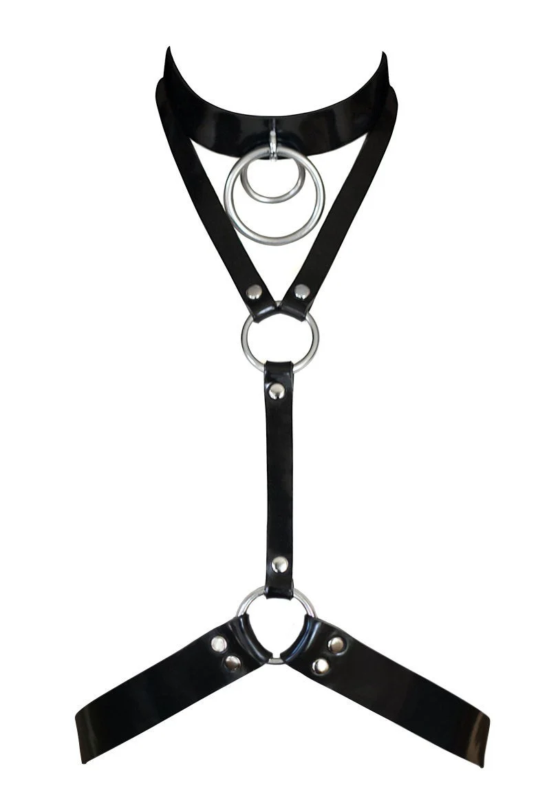 The 'Imperium' harness is handcrafted of extra thick latex and features steel o-rings. The harness fastens at the back with buckles.